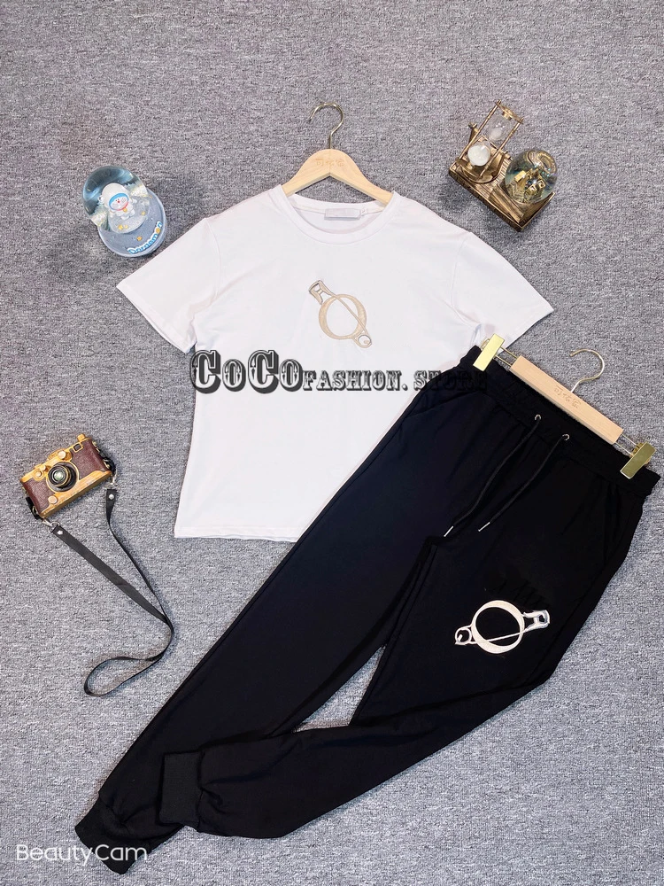 New Discount available for 2021 spring summer luxury branded Embroidery logoed letters two piece set outfits for women pants and short sleeve top tshirt.